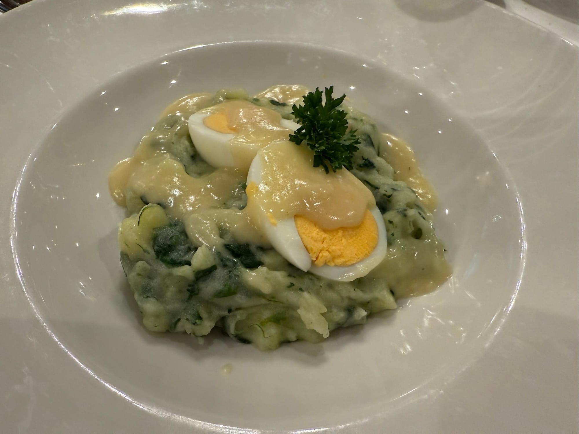 Bevor es dann in Heidelberg richtig losging, gab es an Bord der Saxonia noch ein Mittagessen zur Stärkung. Auf dem Plan stand Hausmannskost: Senfeier mit Kartoffelstampf, Senf-Rahmsauce und Blattspinat.
